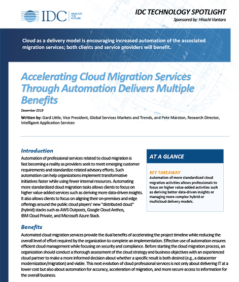 Read this IDC Technology Spotlight to see how accelerating cloud migration services with automation not only speeds up project timelines, but also allows staff to focus on value-added tasks like gaining data-driven insights.